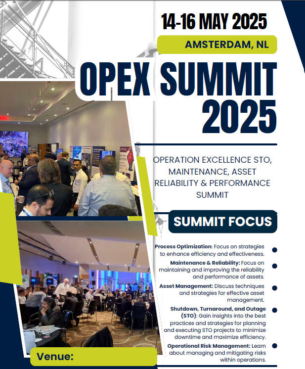 Join us at the Operational Excellence and Asset Reliability and Performance Conference, where industry leaders, experts, and practitioners unite to explore cutting-edge trends and best practices in operational excellence, asset management, maintenance, and STO (Shutdown, Turnaround, and Outage). This conference offers diverse teams and tracks, each focusing on specific aspects of operational excellence. Themes include Leadership & Culture, Process Optimization, Operational Risk Management, Operations Management Systems, Human Factors, Asset Management, Process Safety, Environmental Excellence, Digital Transformation, and advanced maintenance techniques. Participants will receive invaluable insights and practical solutions to enhance efficiency, manage risks, and ensure the reliability and performance of their assets.